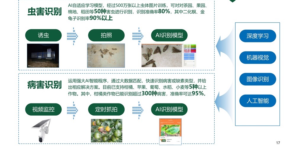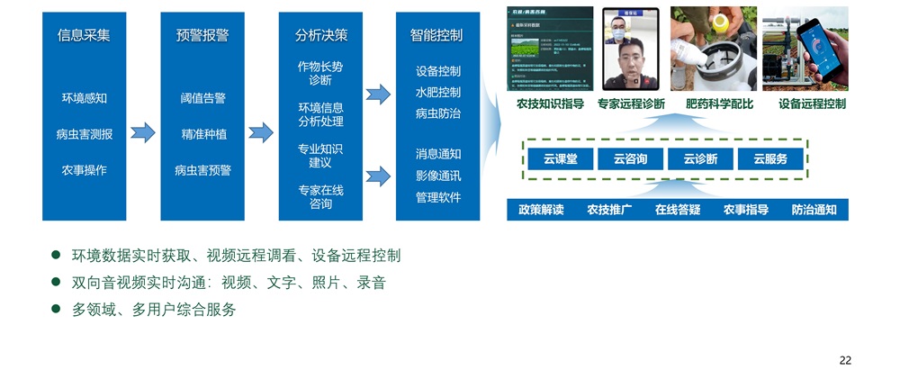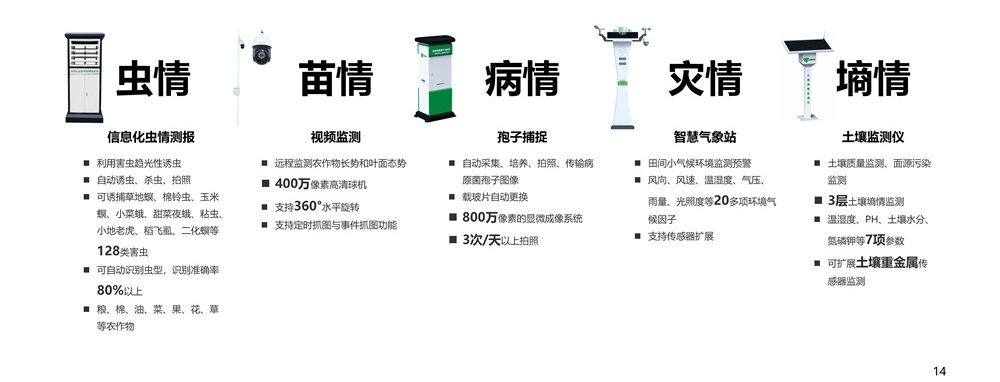 依托物聯(lián)網(wǎng)蟲情、病情、苗情、災(zāi)情、墑情等監(jiān)測(cè)設(shè)備,搭建農(nóng)作物蟲害趨勢(shì)、病害病原、生長(zhǎng)態(tài)勢(shì)、氣候因子、土壤肥力等種植環(huán)境全要素自動(dòng)化、數(shù)字化、智能化的信息采集云平臺(tái),實(shí)現(xiàn)農(nóng)作物重大病蟲疫情監(jiān)測(cè)預(yù)警、作物長(zhǎng)勢(shì)遠(yuǎn)程監(jiān)控、田間小氣候環(huán)境預(yù)報(bào)、土壤質(zhì)量評(píng)價(jià),保證農(nóng)作物在最適宜環(huán)境條件下生長(zhǎng),為精準(zhǔn)種植、專家診斷、病蟲害防治提供可靠的數(shù)據(jù)支撐。